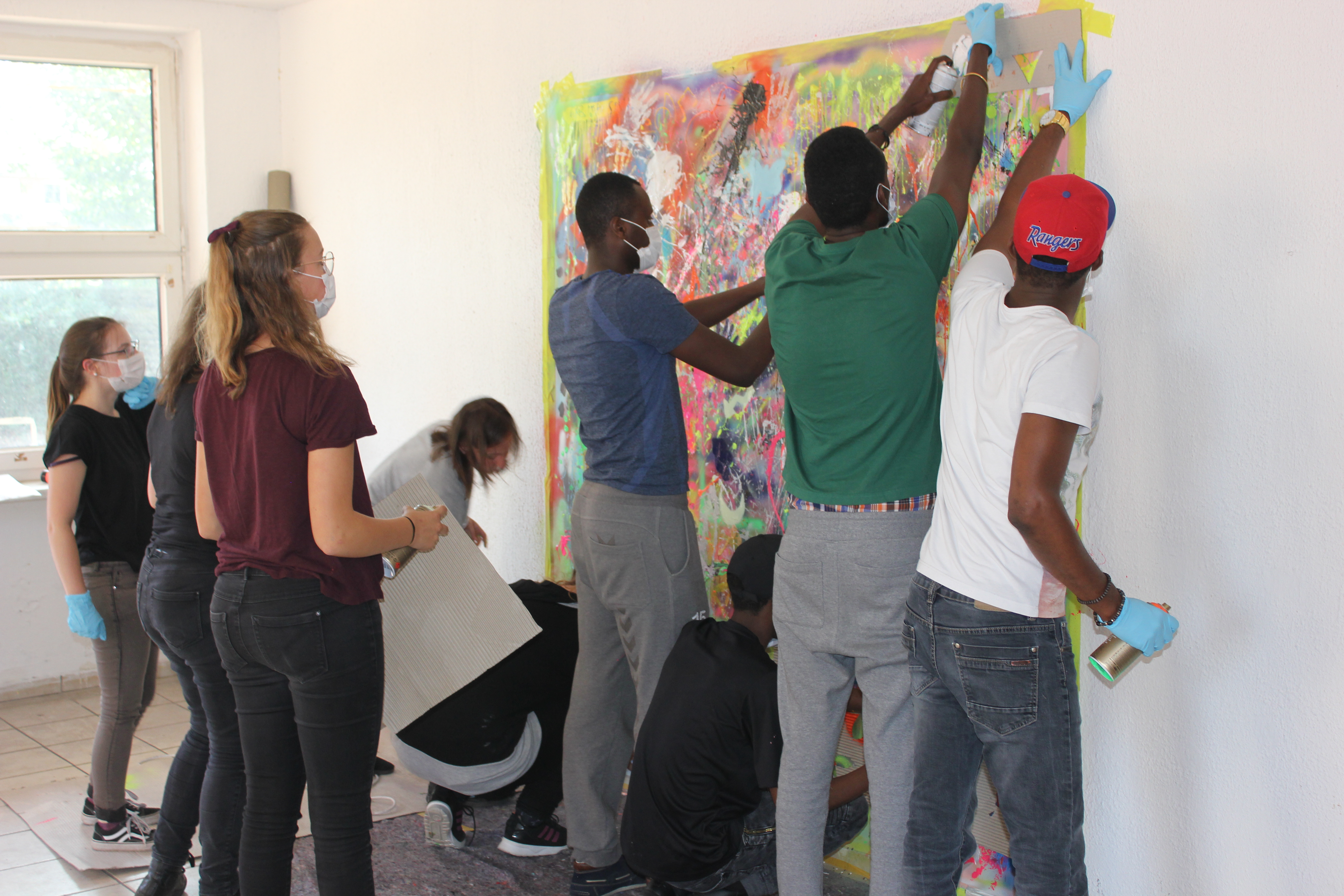 Sowohl einheimische als auch geflüchtete Jugendliche hatten sich zahlreich für diesen Workshop angemeldet. Unter dem Motto „Momente der Erinnerung werden zu Momenten der Ewigkeit“ durften sie unter professioneller Anleitung des Künstlers Niko Nikolaidis ein Bild kreieren, das aus der spontanen Kreativität der Teilnehmenden heraus entstanden ist.