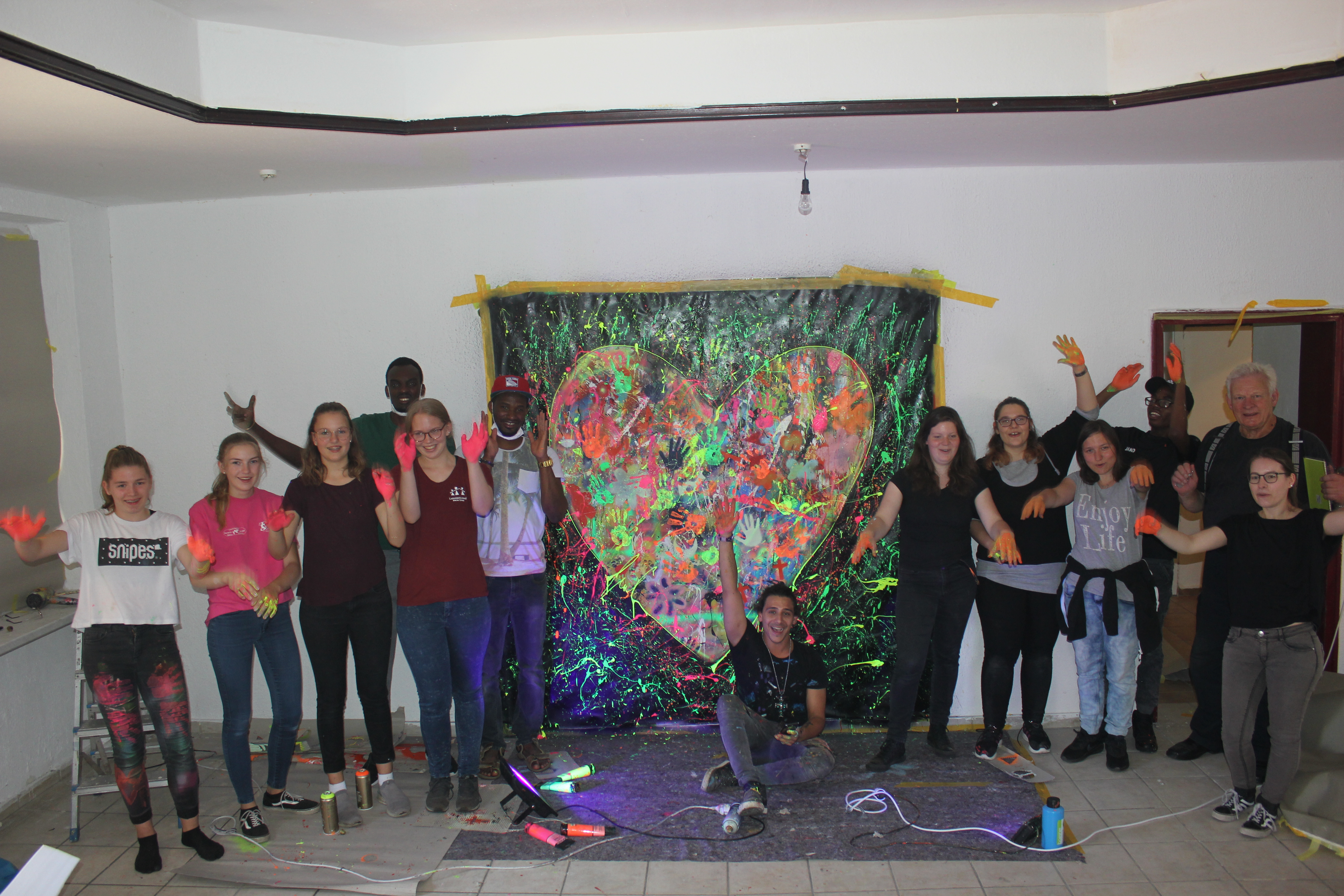 Die Teilnehmenden hatten die Möglichkeit, mit unterschiedlichsten Farben und Techniken Ihren Gedanken freien Lauf zu lassen. Das Highlight war das Malen mit Acrylfarben, die im abgedunkelten Raum mit der Benutzung von UV-Licht nochmal eindrucksvoll zur Geltung gekommen sind. Ergebnis war ein absolut fröhlicher und herzlicher Workshop, der bei allen Mitwirkenden wertvolle Erinnerungen und Erfahrungen hinterlassen hat sowie ein farbenfrohes Gesamtkunstwerk.