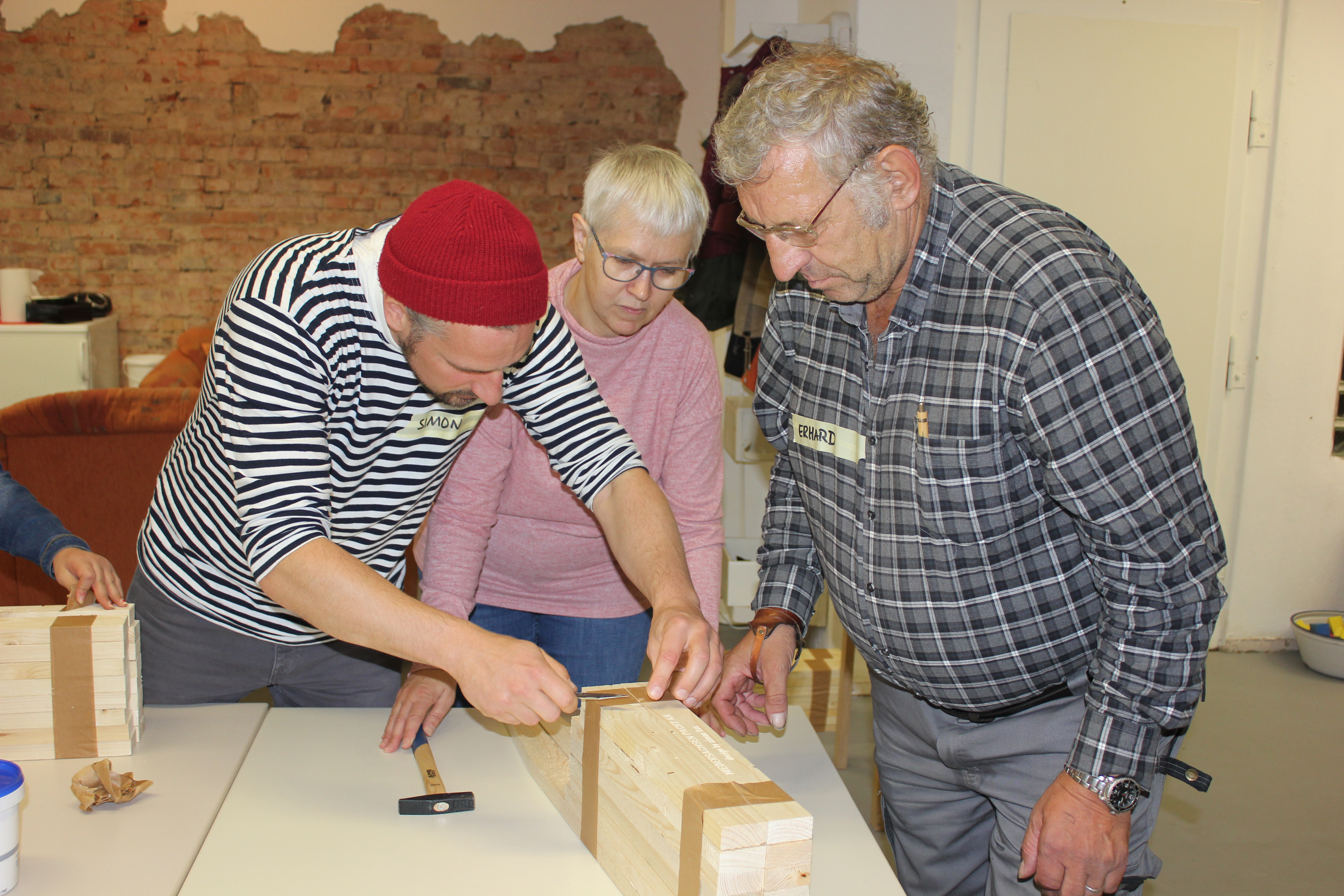 Unter professioneller Anleitung des hannoverschen Industriedesigners Simon Kux trafen sich die Teilnehmerinnen und Teilnehmer im "Treffpunkt für Begegnung und Beratung" der Johanniter-Unfall-Hilfe e.V. Regionalverband Südniedersachsen im Herzen von Lamspringe. In Zweier-Teams wurden unter der Anleitung von Simon Kux eigene Stühle kreiert, die im Anschluss auch mit nach Hause genommen werden konnten. So konnten alle Teilnehmenden eine bleibende Erinnerung an diesen außergewöhnlichen Workshop mit nach Hause nehmen.