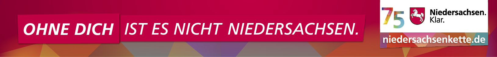 "Ohne Dich ist es nicht Niedersachsen". Unter diesem Motto feiert das Land Niedersachsen in diesem Jahr seinen 75. Geburtstag. Zeigen Sie gemeinsam mit uns wie bunt und vielfältig Niedersachsen ist und machen Sie mit bei der Aktion Niedersachsenkette.