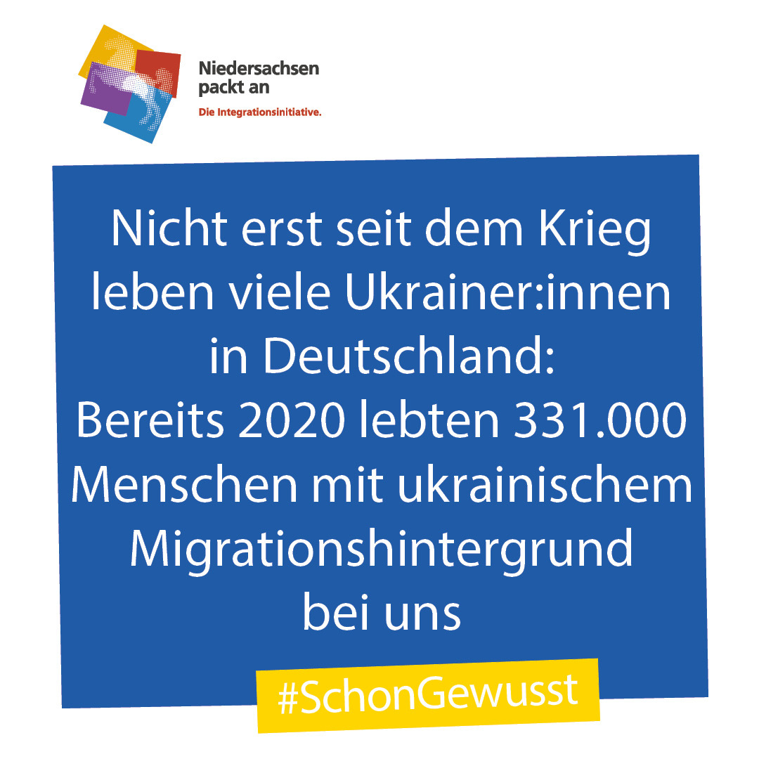 #SchonGewusst? Nicht erst seit Putins Krieg leben viele Ukrainer:innen in Deutschland: Nach Angaben des Mediendienst Integration lebten im Jahre 2020 331.000 Menschen mit ukrainischem Migrationshintergrund in Deutschland.