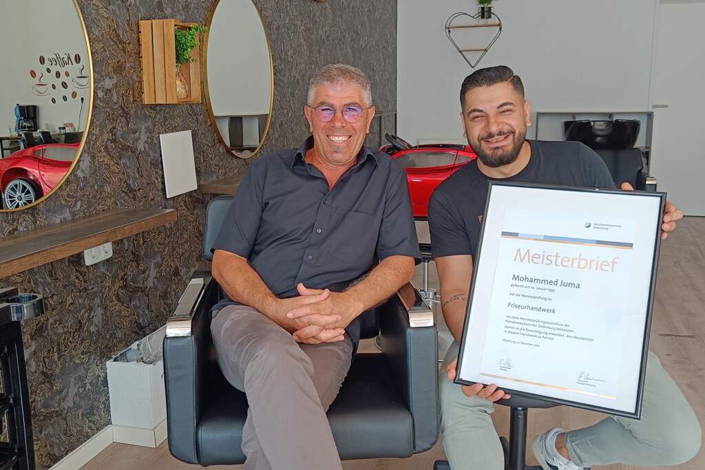 Offen und neugierig hat Mohammed Juma die Deutschen gefragt, wie die Dinge in diesem Land funktionieren. Nach einer Kompetenzfeststellung durch das IHAFA-Projekt und einem Praktikum begann er die Ausbildung zum Friseur. Das Bestehen der Gesellenprüfung habe ihn „stolz“ gemacht – und das Ergebnis der Meisterprüfung „mega-stolz“. Austausch und intensive Beratung fand er immer bei Hussein Kerri. Juma erzählt weiter: „Danach habe ich als Angestellter in einem Oldenburger Salon bei der Ausbildung der Azubis geholfen und mit dem Chef über Kalkulation und andere Dinge der Betriebswirtschaft gesprochen.“