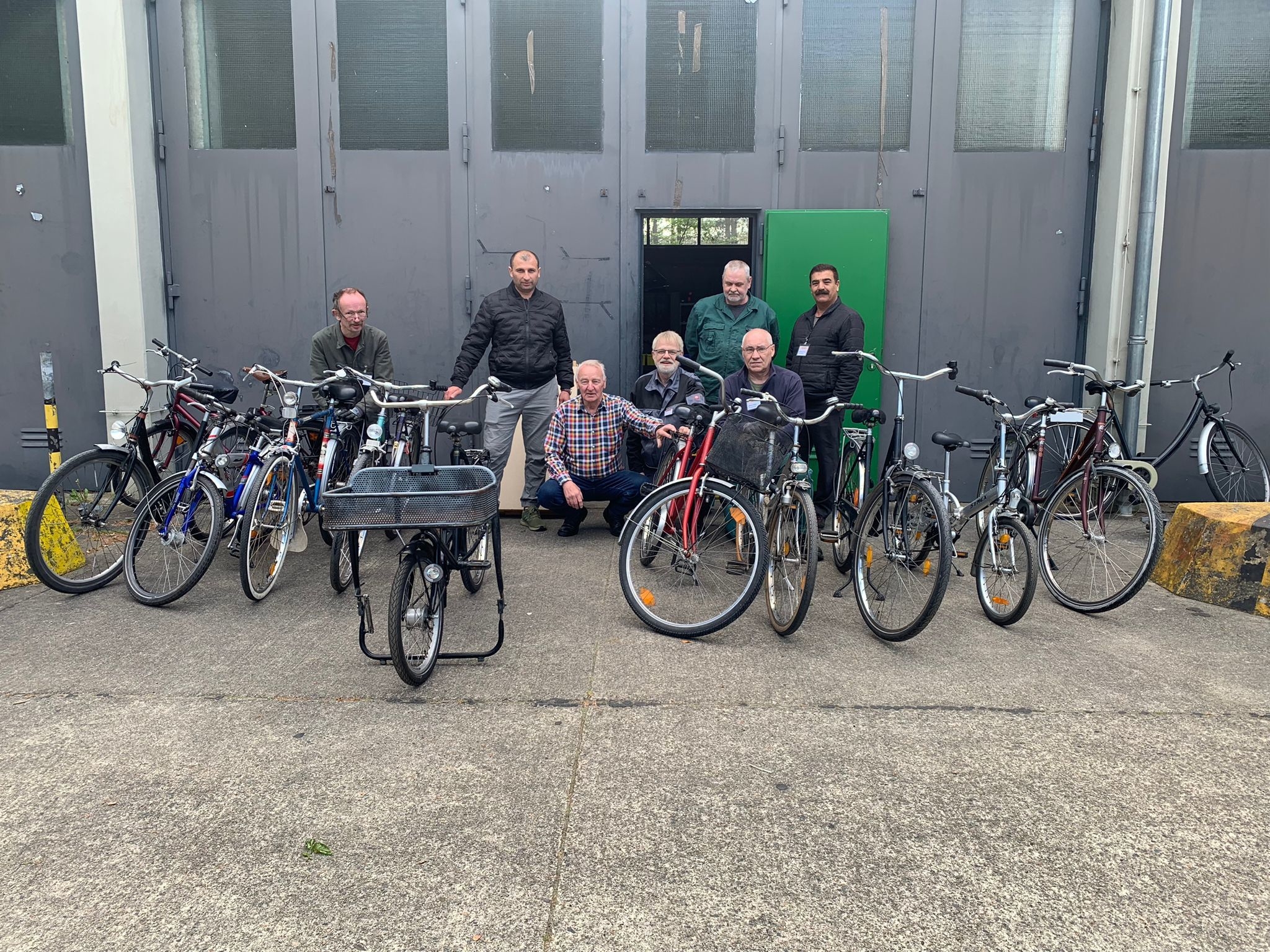 Der Leiter der Butting-Fahrradwerkstatt, Ralf Lampe (4. v. rechts) und sein Team hatten 15 intakte Fahrräder und ein Lastenfahrrad im Gepäck. Lavin (2. v. links) hilft ehrenamtlich mit in der Fahrradwerkstatt. Er wohnt mit seiner Familie in Ehra und unterstützt Horst Trzonnek (Mitte).