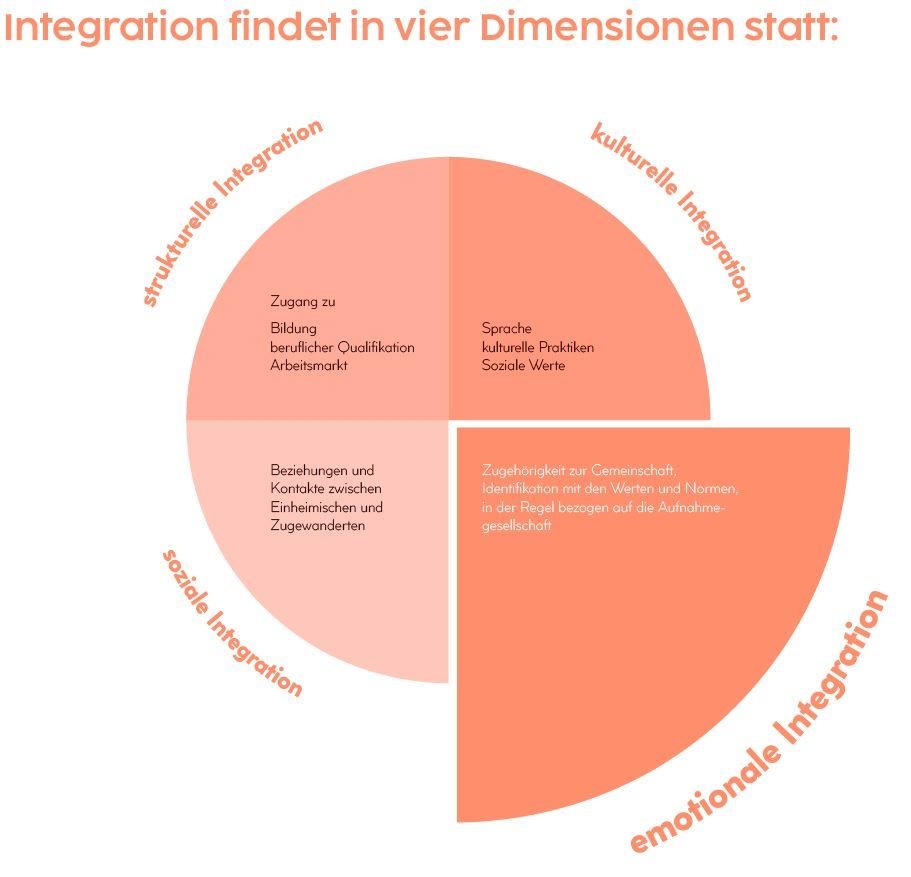 Sechs Jahre nach der Flüchtlingskrise 2015 plante der Landkreis Peine einen Abschlussbericht zur Integration. Herausgekommen ist ein Konzept für die Zukunft, denn unter Integration kann es nach Ansicht der Autorin keinen Schlussstrich geben. In dem 79-seitigen Dokument legt der Landkreis die Basis für Antworten und Maßnahmen für alle vier Dimensionen der Integration (siehe Grafik). Das Konzept sieht unter anderem vor, die Integration in drei Phasen zu verstetigen und zu professionalisieren.