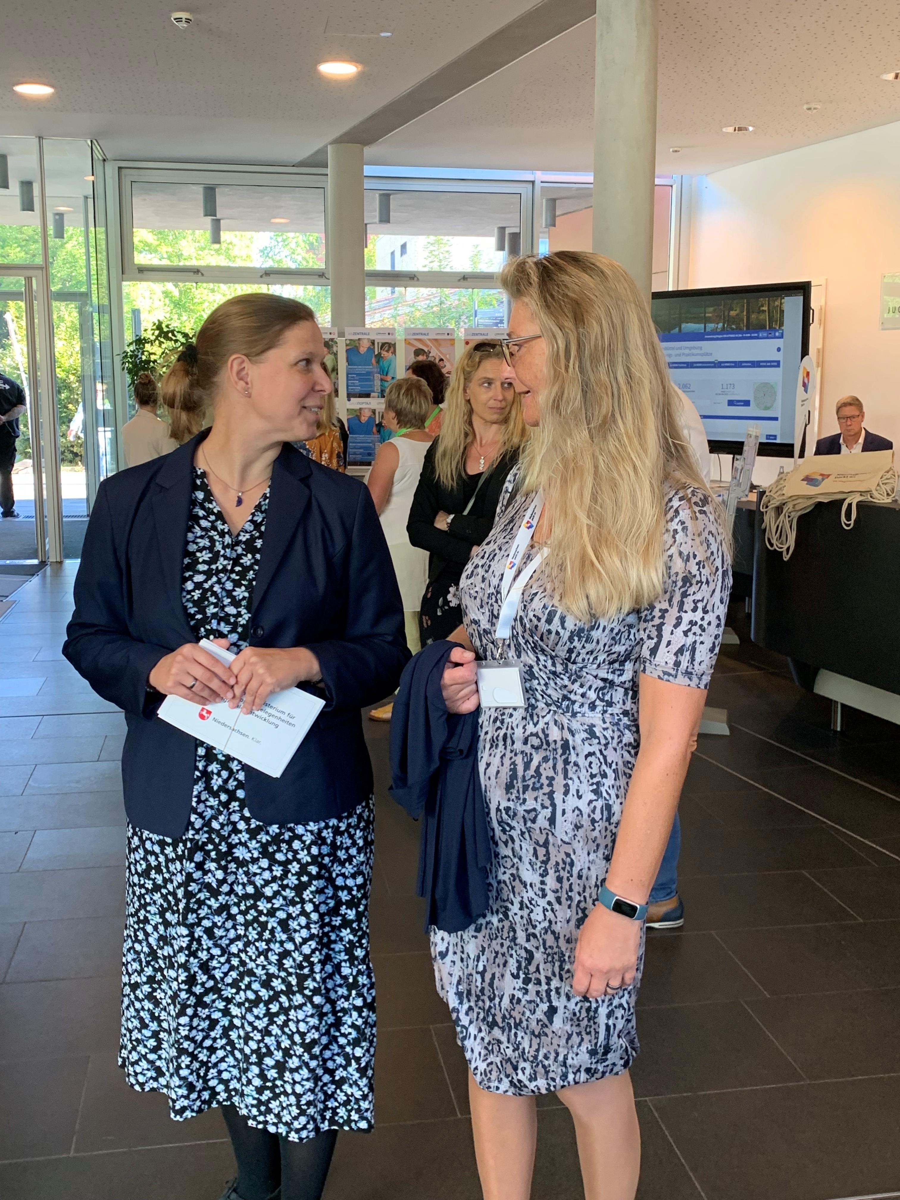 Die Jobbörsen für Geflüchtete und mögliche Arbeitgeber starteten am Mittwoch, den 6. September, mit zwei Veranstaltungen in Wolfenbüttel und Lüneburg ins zweite Halbjahr. In Wolfenbüttel nutzten zahlreiche Besucherinnen und Besucher die Gelegenheit, sich in der Landesmusikakademie Niedersachsen bei mehr als 25 personalsuchenden Unternehmen und Institutionen nach Jobs zu erkundigen. Regionalministerin Wiebke Osigus eröffnete die Messe, die von dem Jobcenter Wolfenbüttel, der Agentur für Arbeit Braunschweig-Goslar und vom Amt für regionale Landesentwicklung Braunschweig für das Bündnis „Niedersachsen packt an“ organisiert wurde. „Mit dem heutigen Tag setzt sich die Erfolgsgeschichte der gemeinsam entwickelten Regionalen Integrationsmessen fort“, sagte Osigus in Wolfenbüttel.