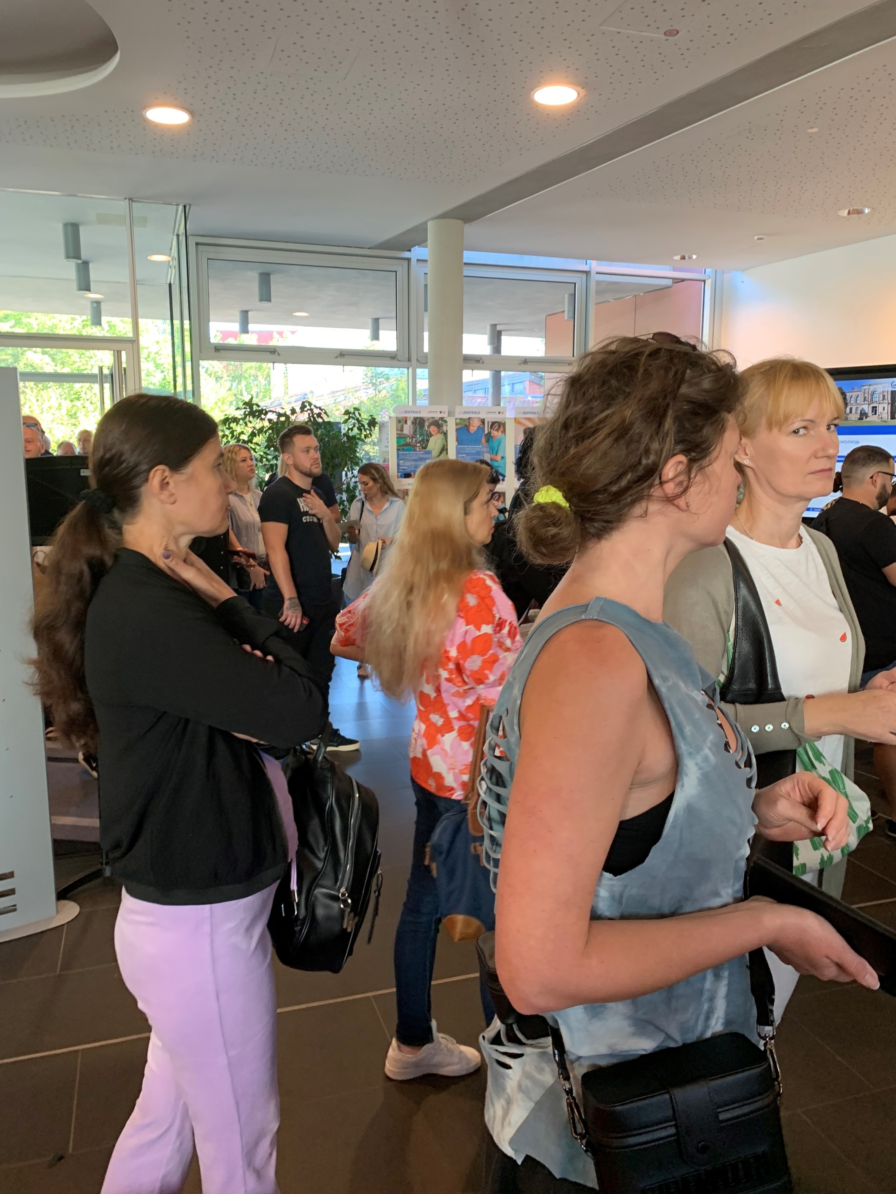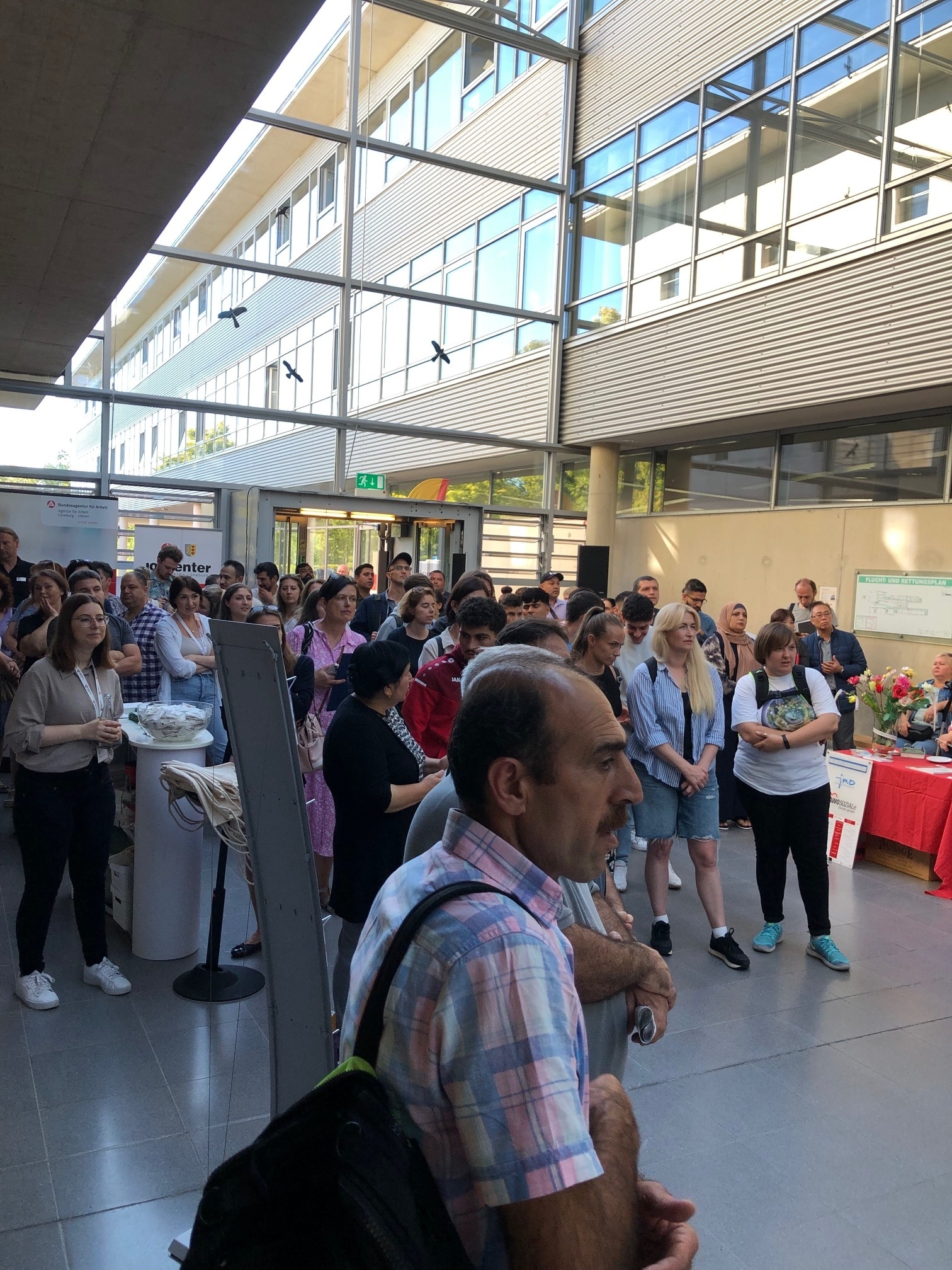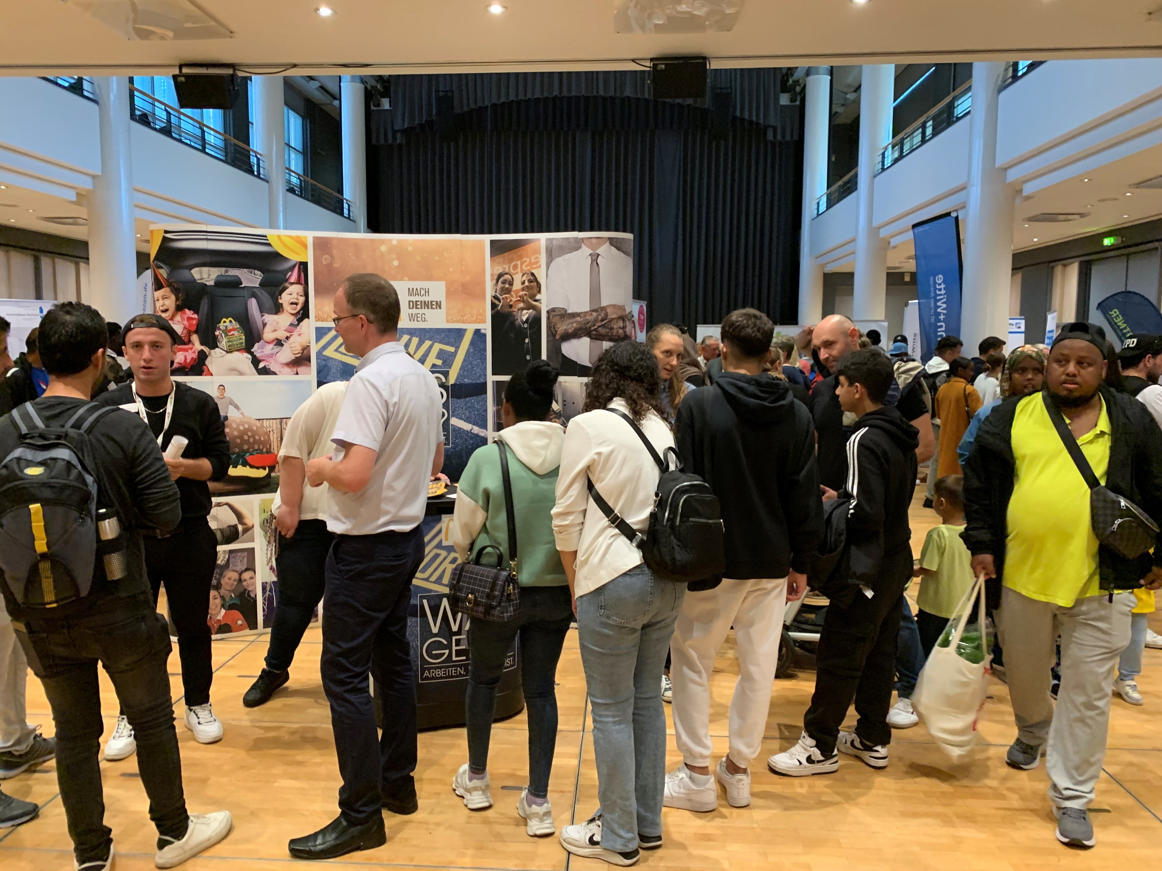 Zur Unterstützung für Menschen, die sich noch nicht in der deutschen Sprache verständigen konnten, hatten die Veranstalter Dolmetscher für Ukrainisch, Russisch, Englisch, Kurdisch, Arabisch und Französisch eingeladen. Einige Arbeitgeber waren aber auch mit Angestellten vor Ort, die ebenfalls Fluchterfahrungen oder hilfreiche Sprachkenntnisse hatten. Diese berichteten den Besuchern von ihren Erfahrungen in den Unternehmen und unterstützen ebenfalls bei den Übersetzungen. Ein Team vom Jobcenter und der Agentur für Arbeit beriet Arbeitgeber und Besucher über die verschiedenen Qualifizierungs- und Fördermöglichkeiten direkt vor Ort.