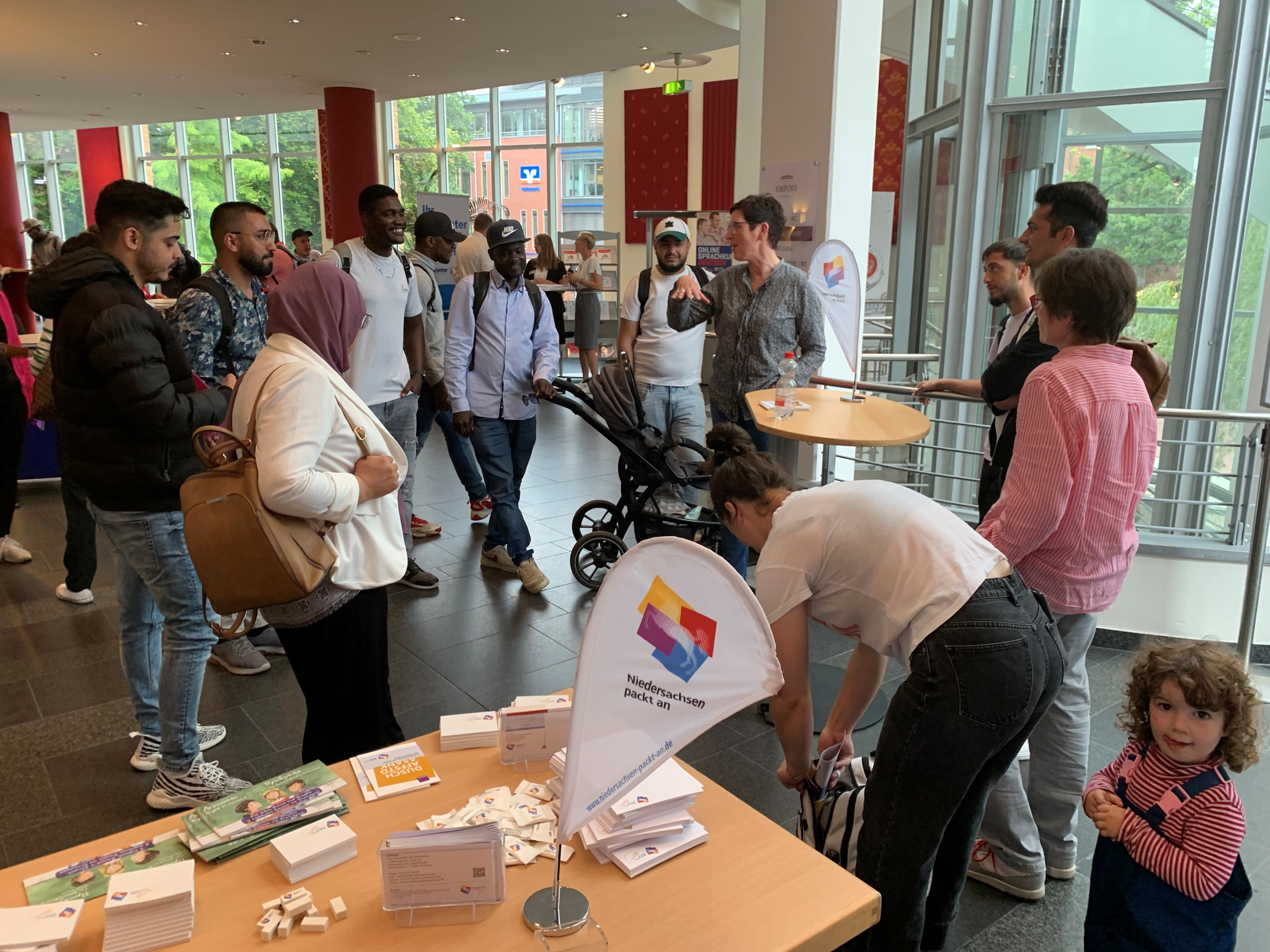 Eine Arbeitsstelle leistet einen wichtigen Beitrag für die Integration von Geflüchteten und Menschen mit Migrationshintergrund. Mehr als 500 Besucherinnen und Besucher nutzten am 20.09.2023 die Gelegenheit, sich im Jobcenter Goslar bei über 20 personalsuchenden Unternehmen und Institutionen zu informieren und Kontakte zu potentiellen Arbeitgebern zu knüpfen. Unter dem Motto „Perspektiven durch Arbeit im Landkreis Goslar“ hatte das überparteiliche Bündnis „Niedersachsen packt an“ gemeinsam mit dem Jobcenter Goslar, der Agentur für Arbeit Braunschweig-Goslar und dem Amt für regionale Landesentwicklung Braunschweig zu der Veranstaltung eingeladen.
