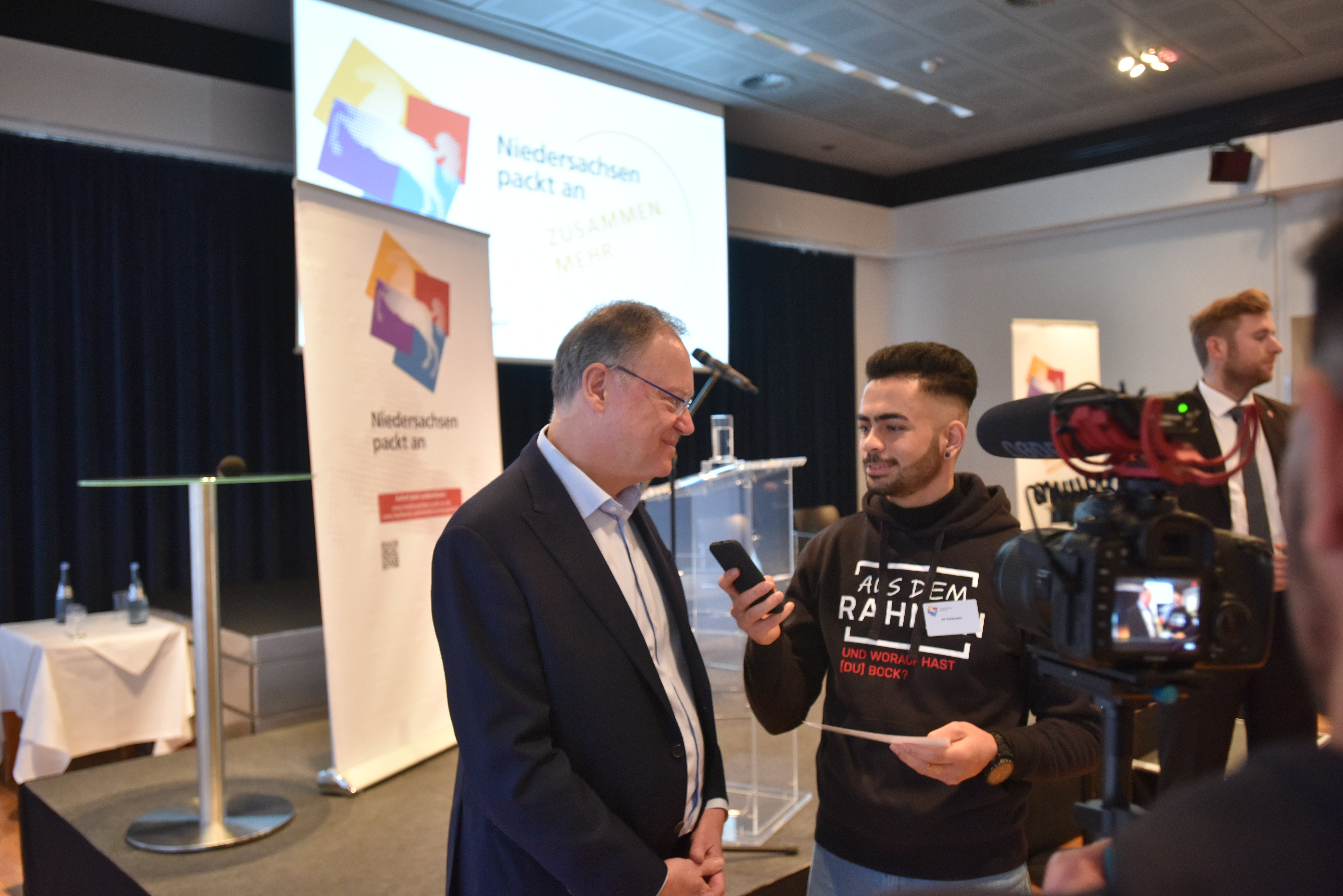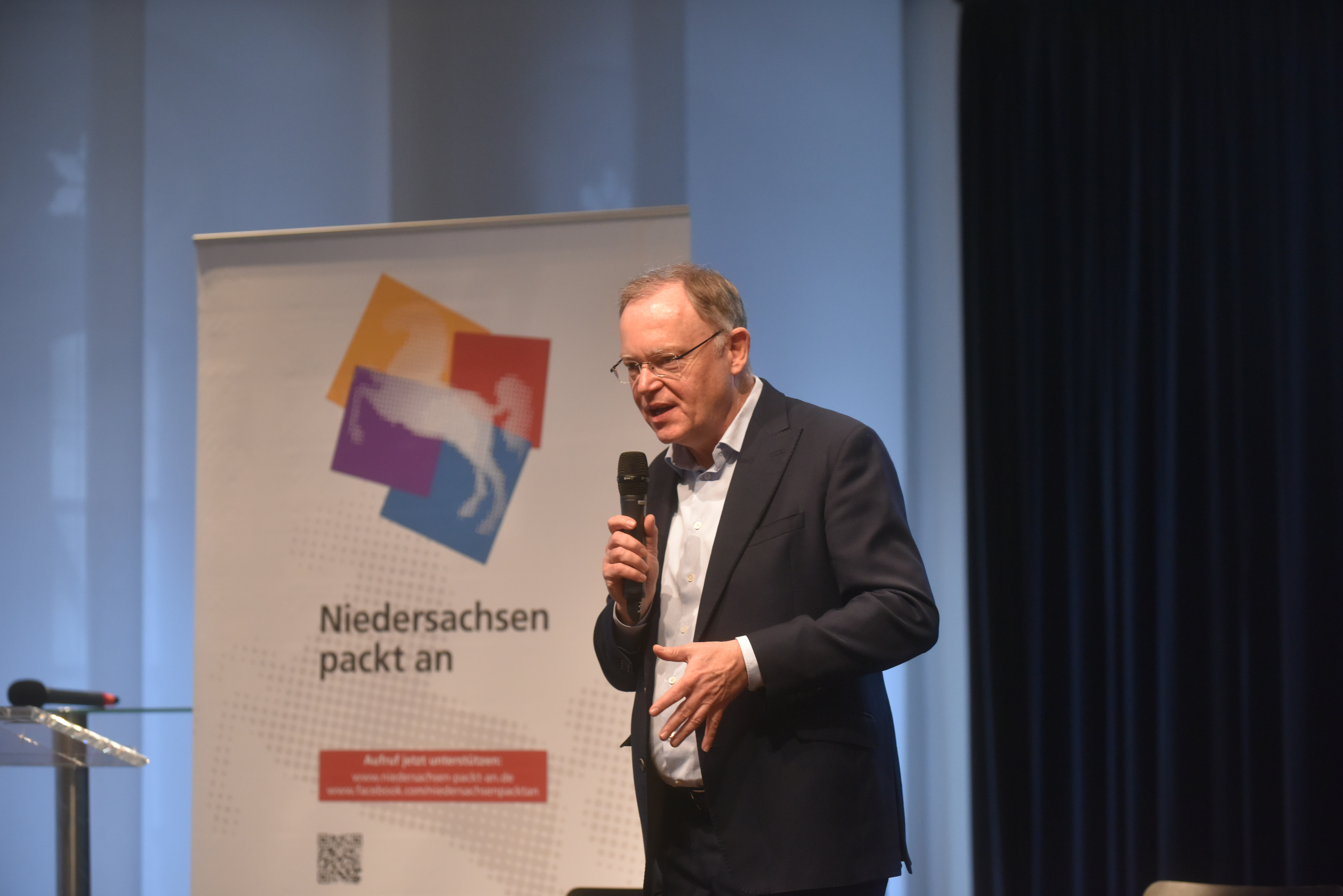 Ministerpräsident Weil würdigte mit einem besonderen Gruß offiziell unsere 3.000ste Unterstützerin im Bündnis, Frau Brigitte Kessner. Sie engagiert sich seit vielen Jahren beim Deutschen Roten Kreuz in Barsinghausen in der Migrationsberatung für Erwachsene.