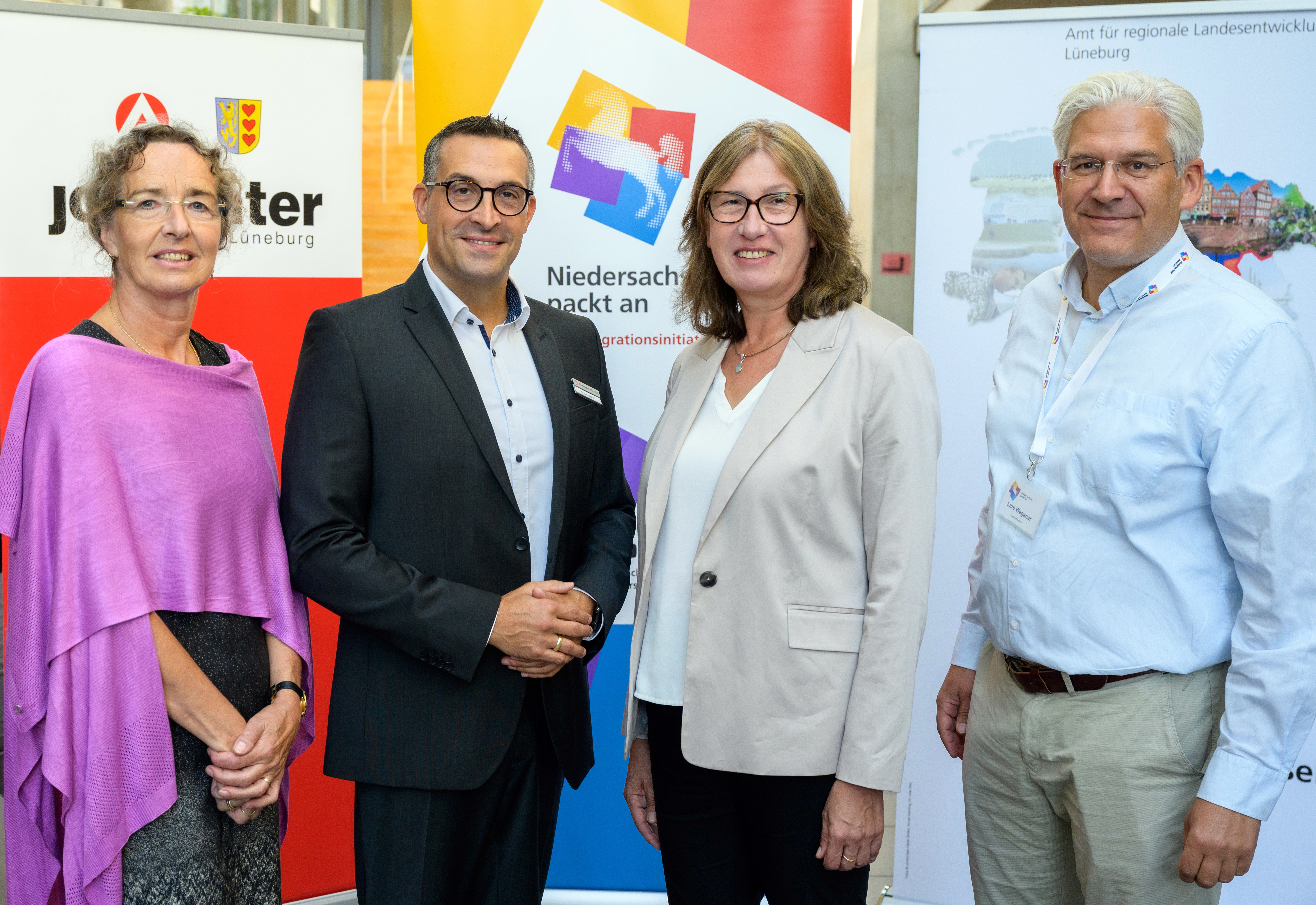 (v.l.n.r.): Angelika Brauer, Geschäftsführerin des Jobcenter Landkreis Lüneburg, Karin Beckmann, Landesbeauftragte und Leiterin des Amtes für regionale Landesentwicklung Lüneburg, Sven Rodewald, Vorsitzender der Geschäftsführung der Agentur für Arbeit Lüneburg-Uelzen, Lars Wegener, Leiter der Geschäftsstelle des Bündnisses „Niedersachsen packt an“, Niedersächsische Staatskanzlei