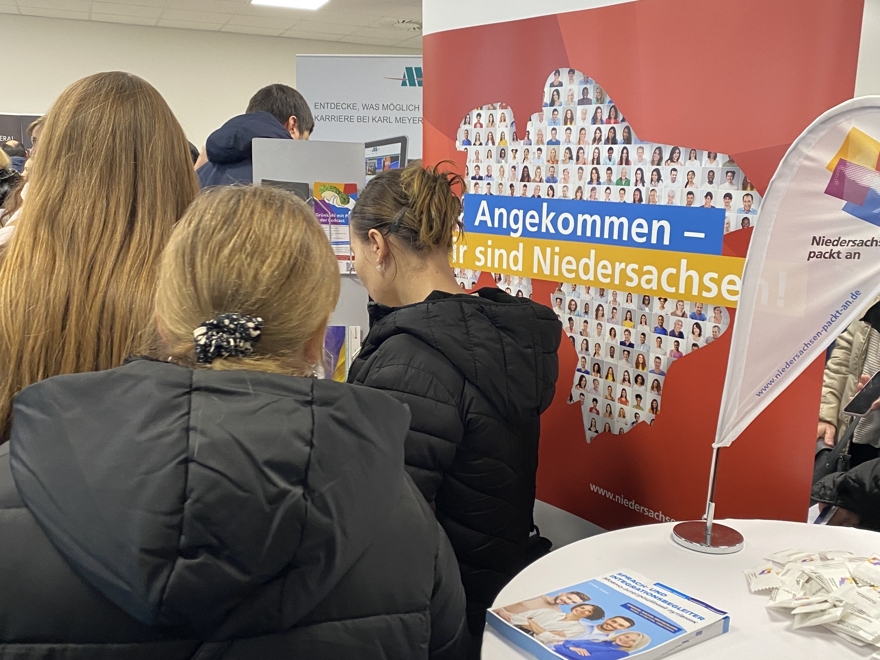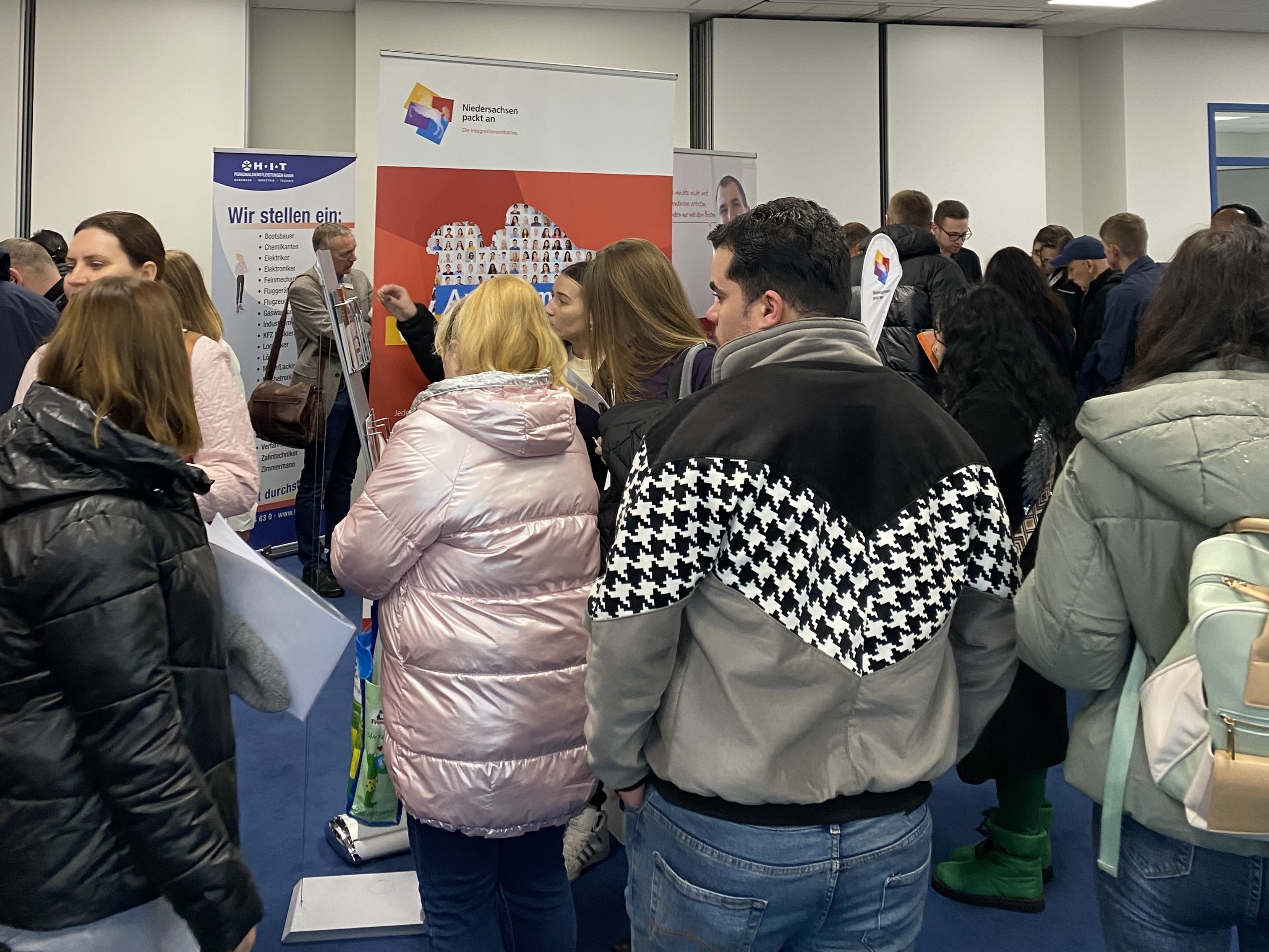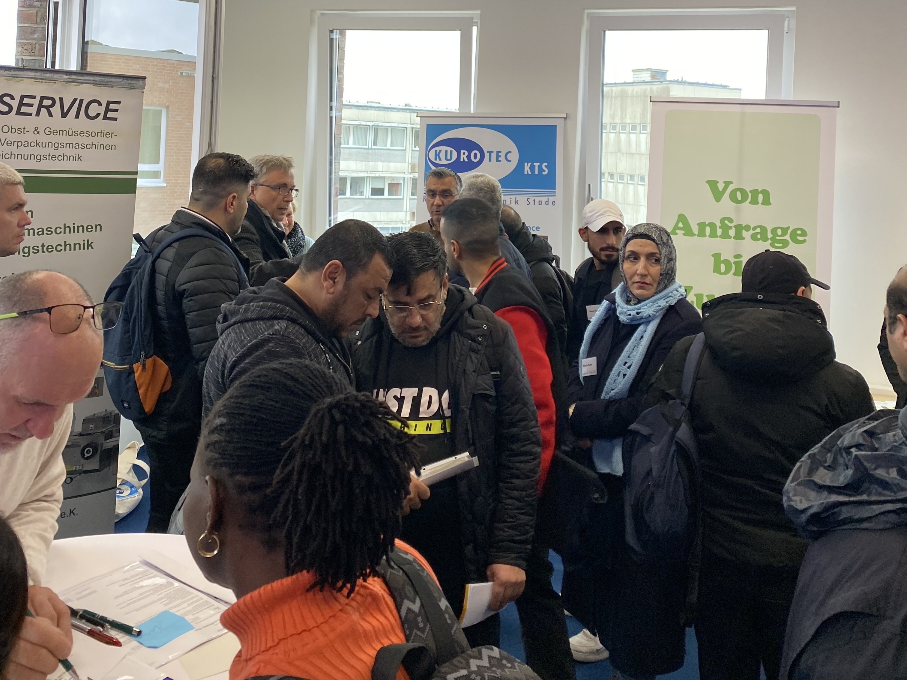 Ob Fahrerinnen und Fahrer, Mechanikerinnen und Mechaniker, Kaufleute, Pflege- oder Reinigungskräfte, der Bedarf an Fachkräften in der Region ist groß. 16 Unternehmen aus der Region nutzten am 9. November 2023 die Chance, sich Menschen mit und ohne Fluchthintergrund vorzustellen, um für sich zu werben. 600 potenzielle Bewerberinnen und Bewerber waren der gemeinsamen Einladung des Jobcenters im Landkreis Stade, des Bündnisses NIEDERSACHSEN PACKT AN, des Amtes für regionale Landesentwicklung Lüneburg und der Agentur für Arbeit Stade gefolgt und besuchten die regionale Jobmesse in den Räumen des Jobcenters im Landkreis Stade.