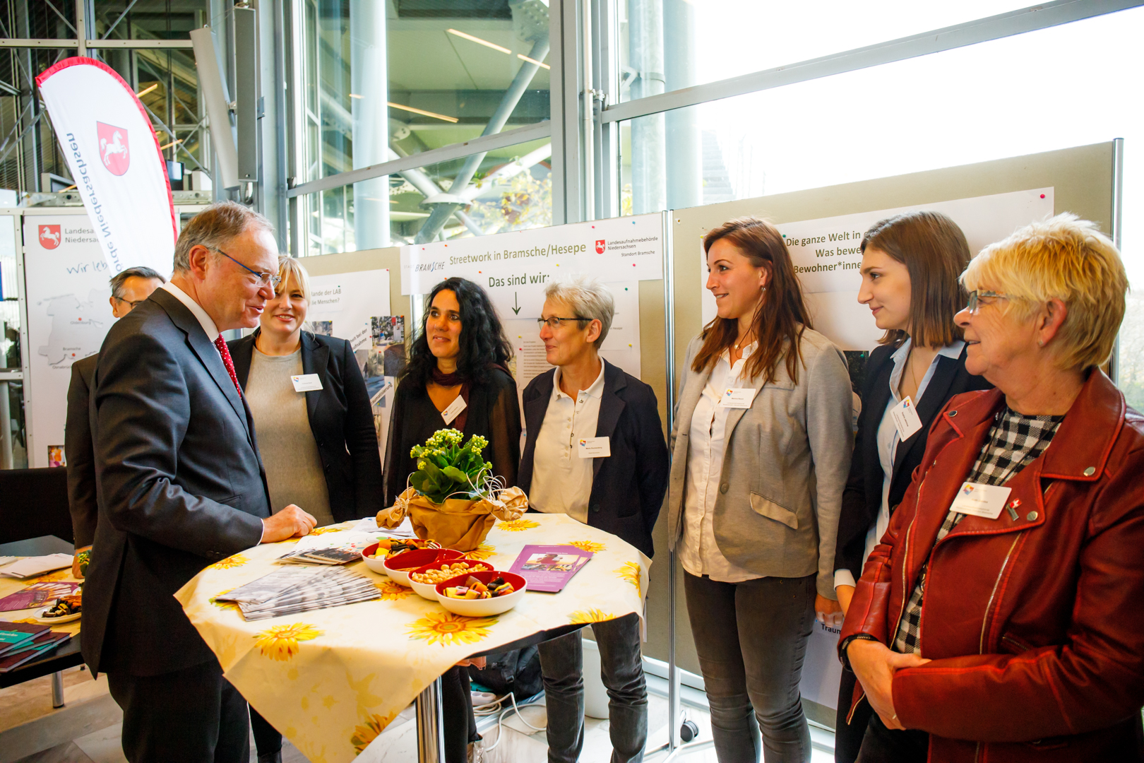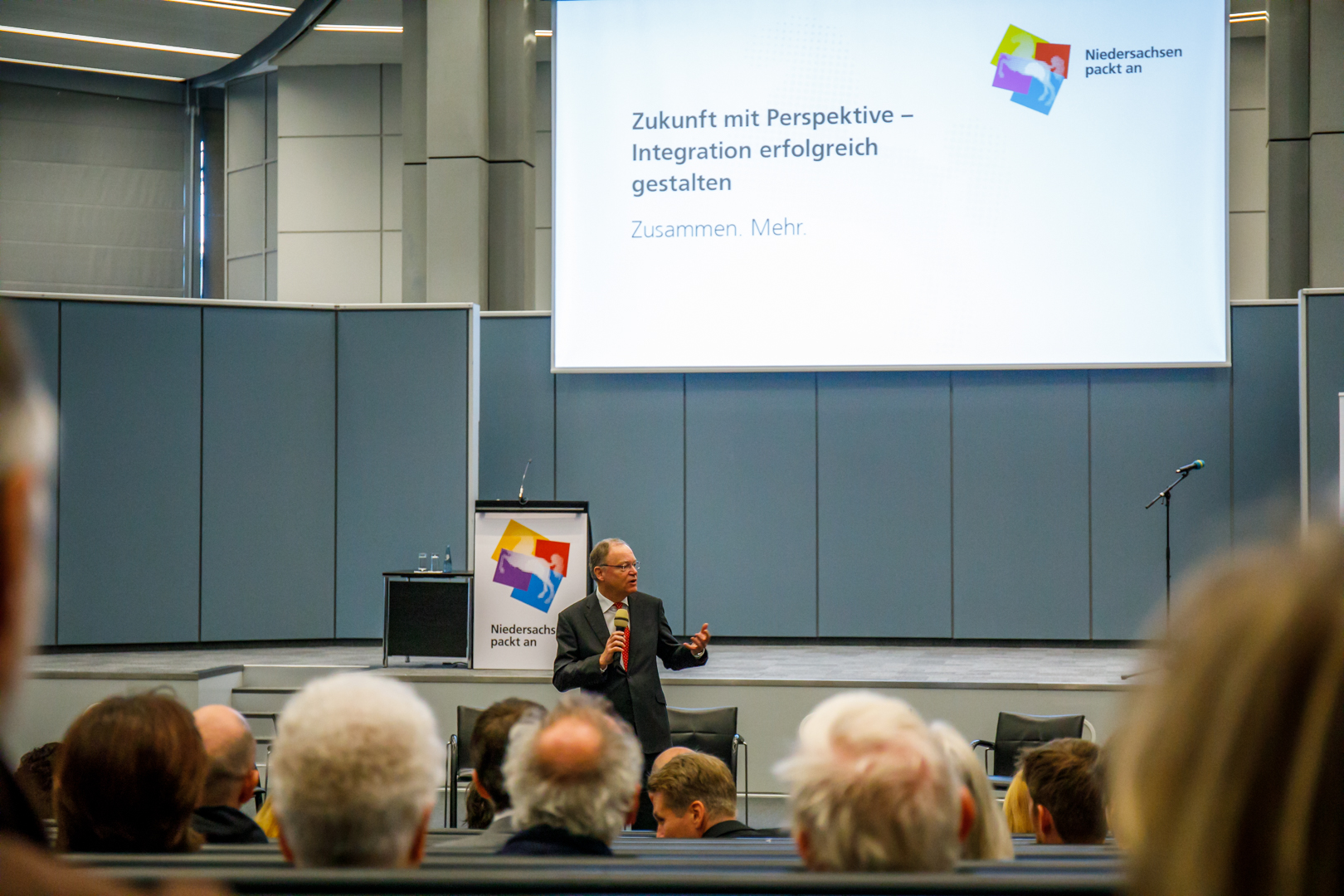 Ministerpräsident Stephan Weil wies in seinem Grußwort vor den rund 500 Gästen darauf hin, dass nur durch gemeinsames Engagement die großen Aufgaben der Gesellschaft erfolgreich bewältigt werden können, nach dem Motto „Zusammen. Mehr“. Das bundesweit einmalige Bündnis trage durch seine vielen Engagierten und Unterstützer, die Initiativen und Projekte, und nicht zuletzt die Bündnispartner selbst zu einer hohen Akzeptanz für die Aufnahme und Integration von Geflüchteten in Niedersachsen bei und schaffe gemeinsam das, was alleine nicht möglich wäre. „Unglaublich viele Menschen und Organisationen haben bislang im Bündnis mit angepackt und damit auch eine klare Haltung gezeigt: Alle Menschen unterschiedlicher Herkunft und Religion sollen friedlich miteinander in diesem Land leben können – für Rassismus und Ausgrenzung ist kein Platz in Niedersachsen. Allen Beteiligten gilt dafür mein herzlicher Dank.“