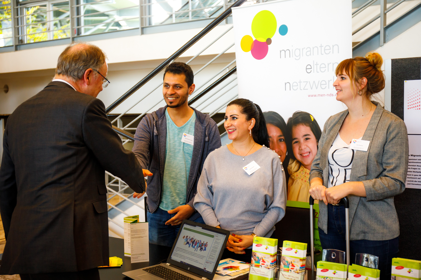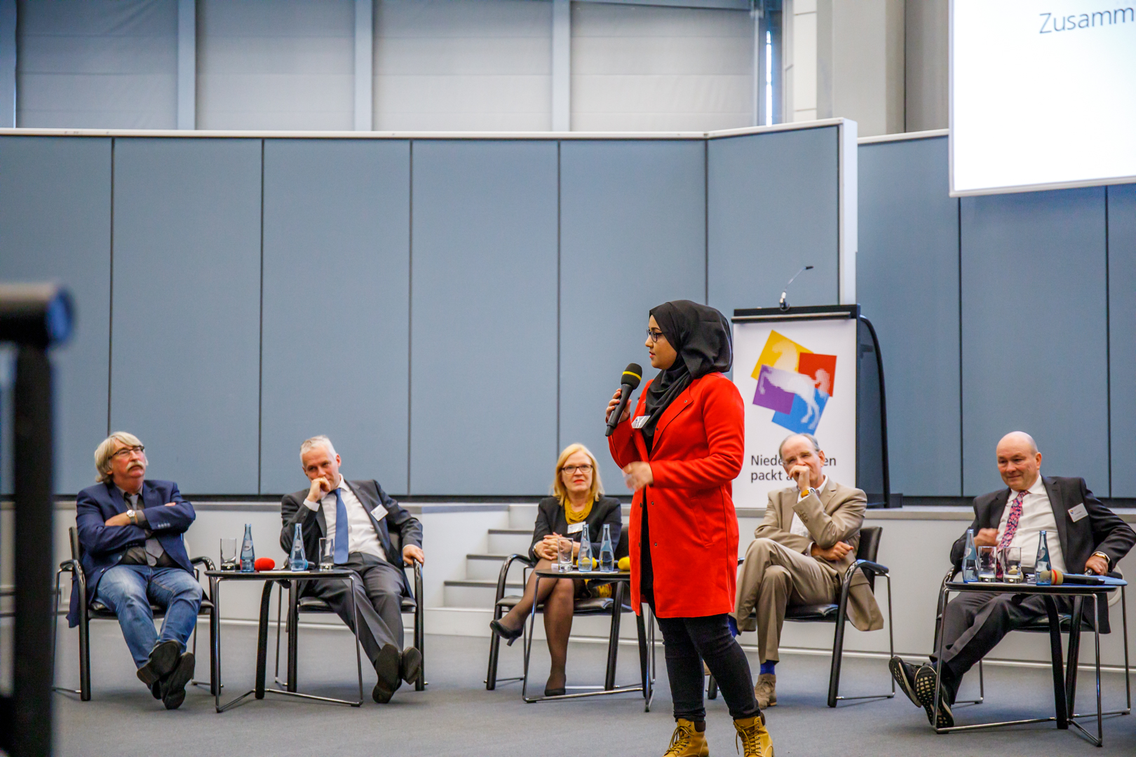 U.a. mit: Ghalib Rababah (pensionierter Dipl.-Informatiker und „Ausbildungs-Pate“ bei PonteAzubis), Ayman Youssef (Auszubildender als Kaufmann für Logistik und Dienstleistungen), Hanin Nader (Praktikantin beim Bündnis „Niedersachsen packt an“).
