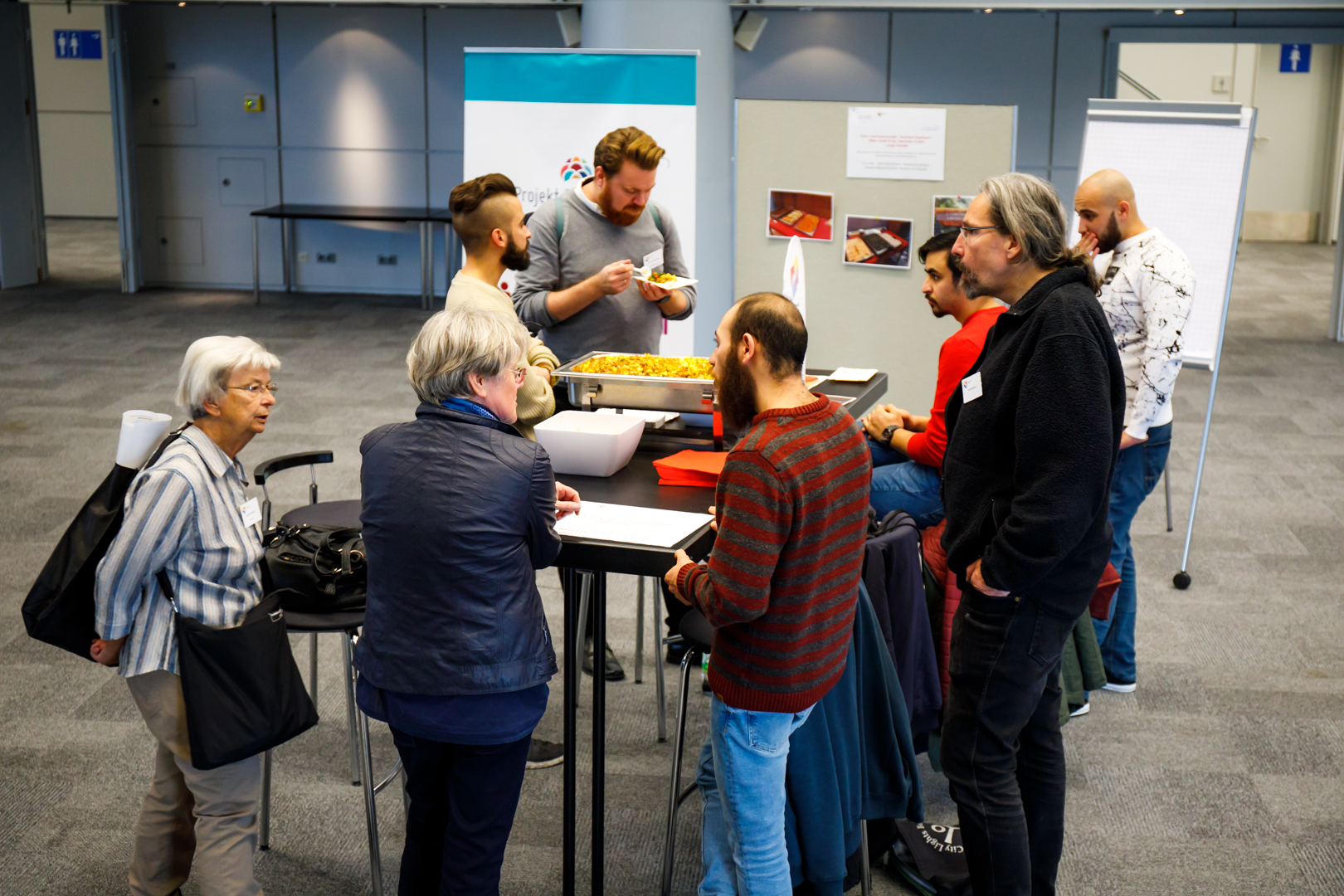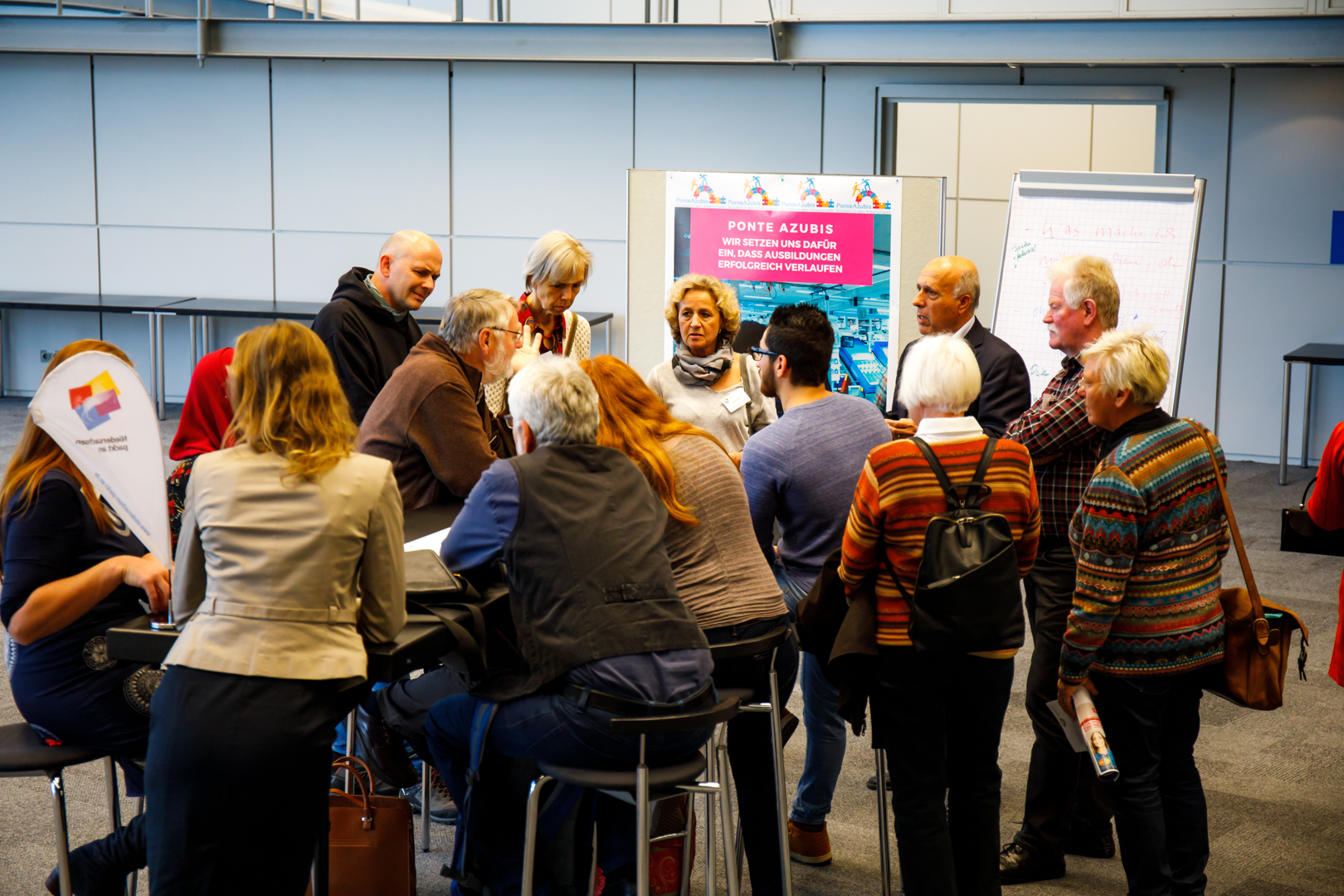 In einem offenen 360° Forum waren die Gäste am Nachmittag der Veranstaltung dazu eingeladenen, mit Geflüchteten, Helfenden, Patinnen und Paten, Sprachlehrenden, Ausbildenden, Kirchengemeinden und anderen Institutionen in Kontakt zu kommen und an deren Erfahrungen teilzuhaben. Insgesamt gab es fünf Themen-Inseln: